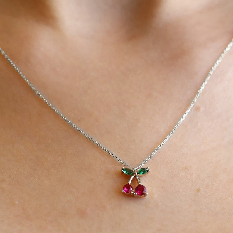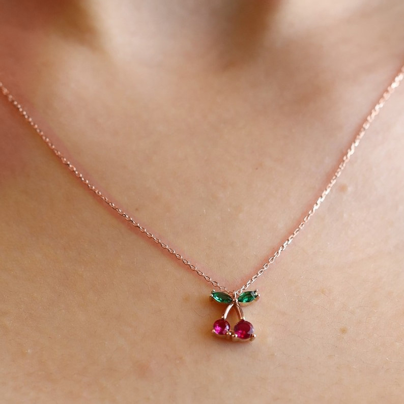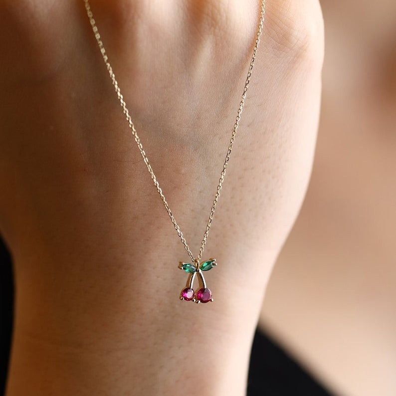 The impressive image that cherry brings to your body will fascinate those who see it.Cherry trees feel a warmth like they bloom in spring, feel it in your body.Emerald-Ruby Cherry gold Necklace.Our jewelry made with special skill and quality craftsmanship.The perfect gift for bonding with precious people.Christmas Day, Prom, Valentine's Day, Holiday,anniversary, Mother's Day, Birthday, Graduation or any special occasion.