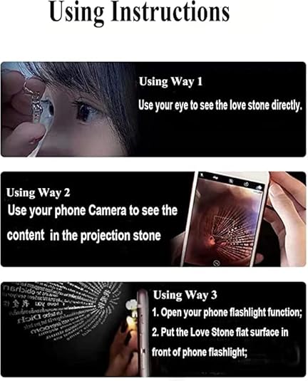 【Projection method 】1. Turn on the phone, use the camera function, and place the protruding side of the stone in front of the phone camera. "I love you" in 100 different languages will be clearly displayed on your phone screen. 2. At night, use a flashlight (or mobile phone’s flash mode) to project pictures or text indoors or outdoors: on walls/grounds/ceilings/trees/grass.