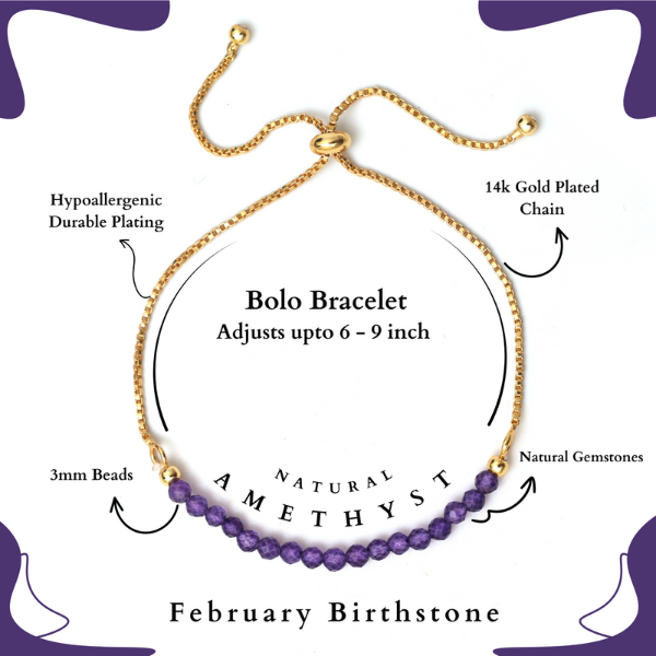 Birthstone Beaded Bracelet: This birthstone jewelry for women features a pull design bracelet adorned with delicate amethyst 3mm faceted beads and features a hypoallergenic 14k gold plated adjustable chain that measures 6-9 inches in length to ensure a perfect fit. Most wrists.
