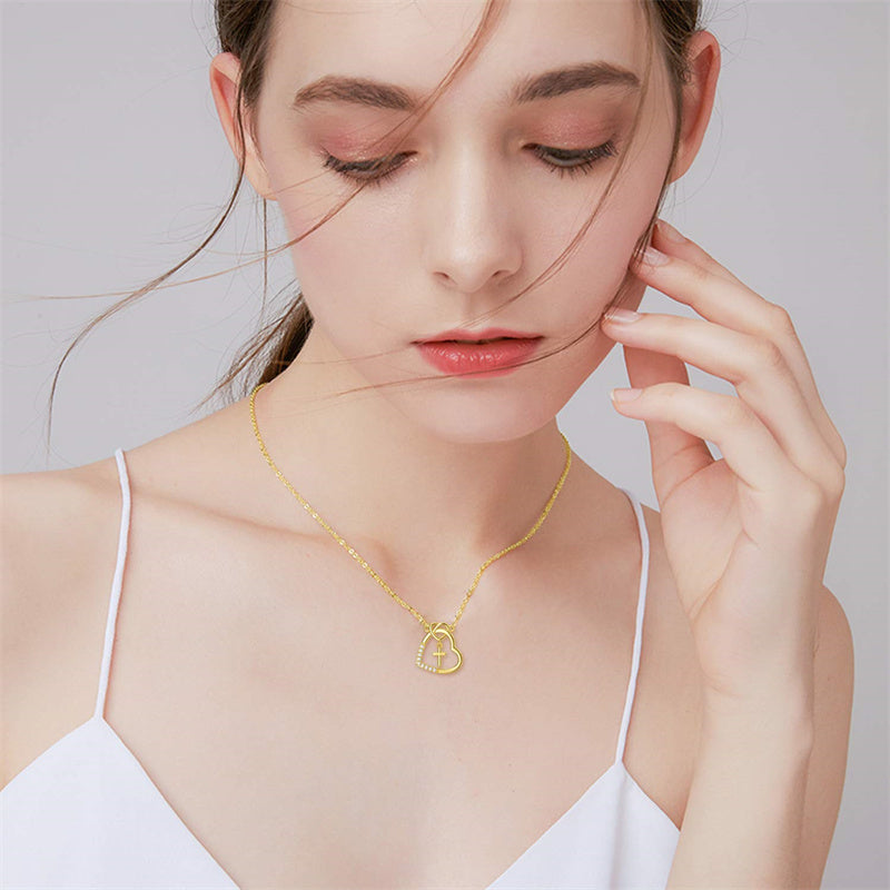14K l Gold Heart Cubic Zirconia Cross Heart Pendant Necklace