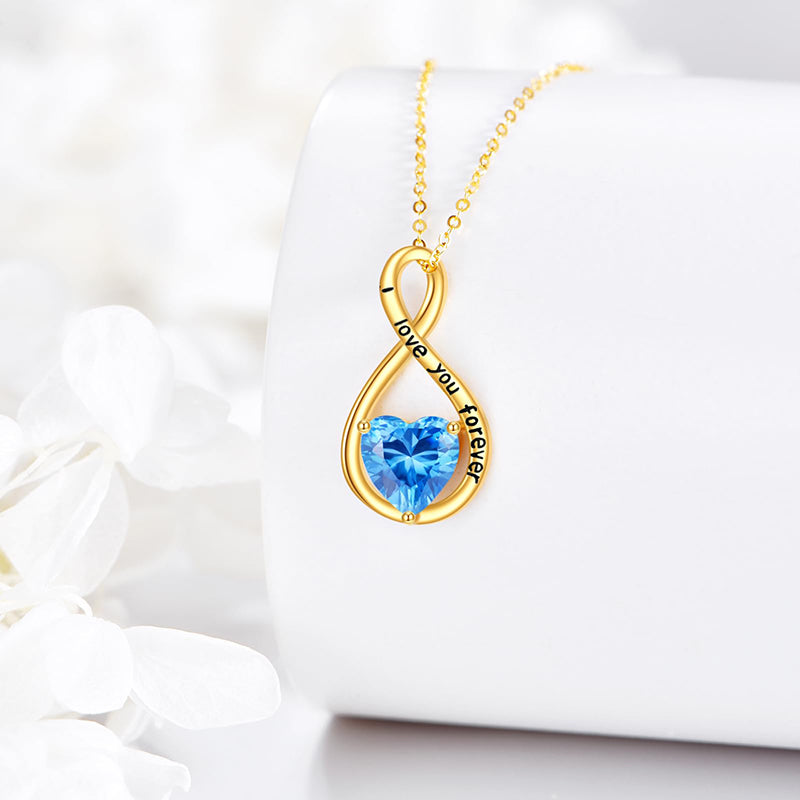 14K Gold Blue Crystal Infinity Heart Pendant Necklace Engraved With I Love You Forever