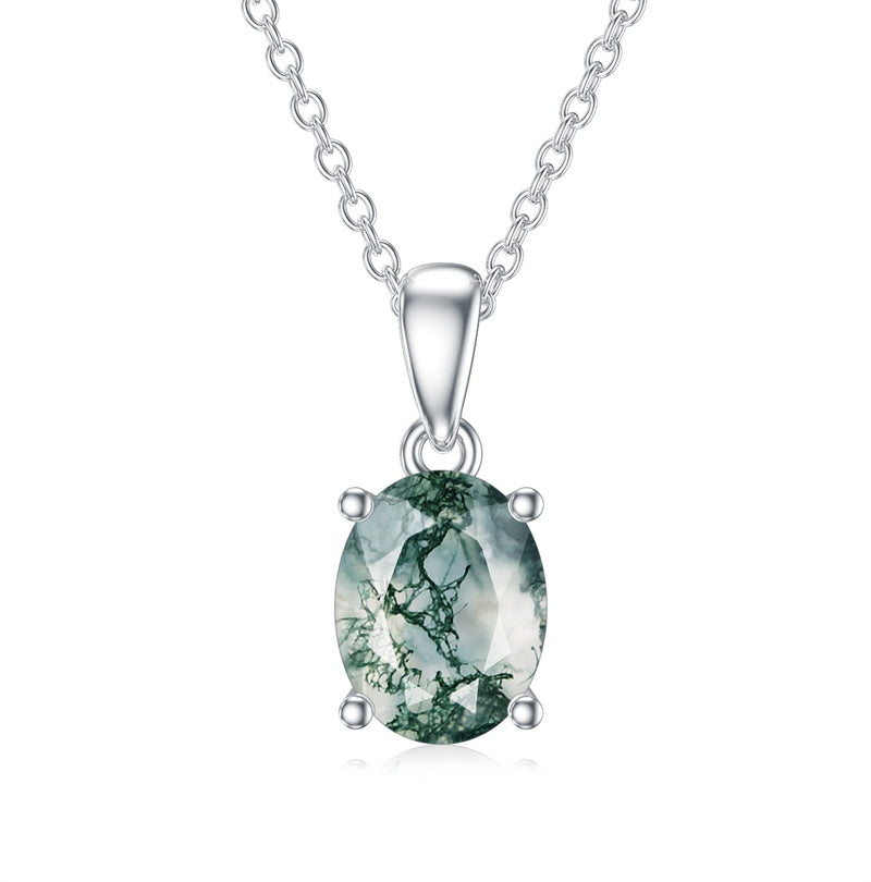 Sterling Silver Oval Pear Cut Green Moss Agate Pendant Necklace