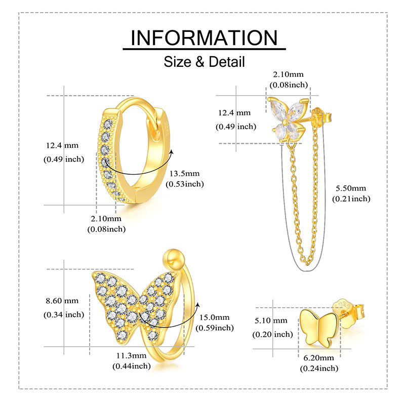 MATERIALS & MEASUREMENTS:The butterfly earring sets is 14k real gold plated, made of genuine 925 sterling silver, hypoallergenic, tarnish resistant, nickel-free, lead-free, cadmium-free, there is no any allergic element.